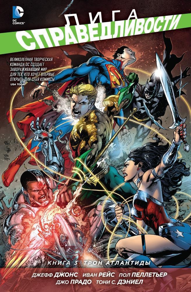 Звездная творческая команда, состоящая из Джеффа Джонса, Ивана Рейса, Пола Пеллетьера, Джо Прадо и Тони С. Дэниела, представляет полномасштабную битву за владычество над сушей и морем! «Лига Справедливости: Трон Атлантиды» объединяет 13–20 выпуски «Лиги Справедливости» и 15-16 выпуски «Аквамена».