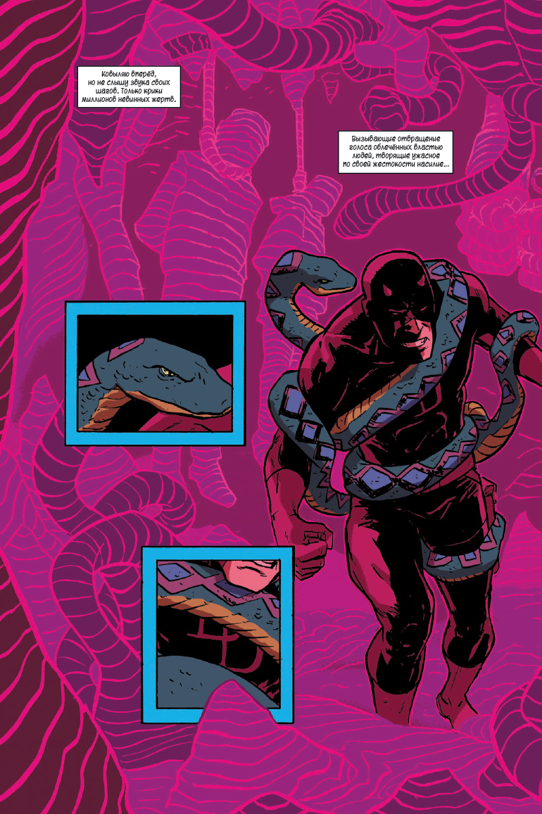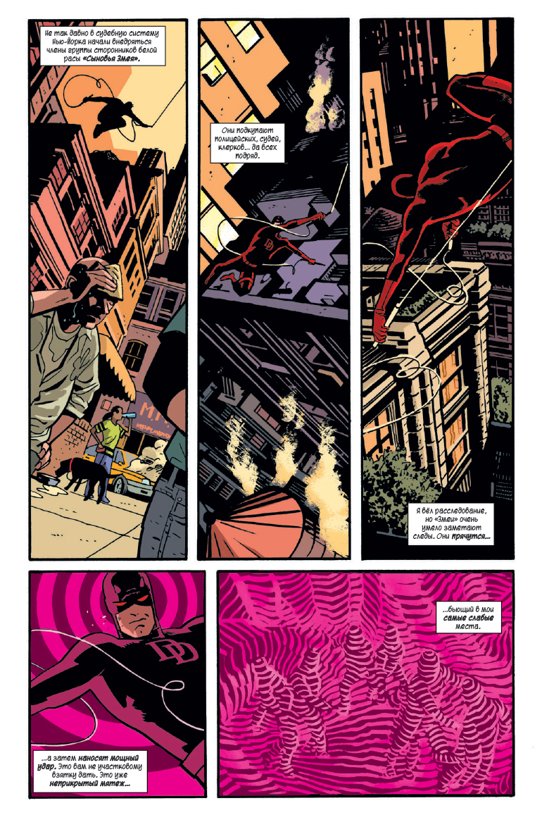 Сторонники белой расы, известные как «Сыновья Змея», проникли во все уровни уголовно-правовой системы. Они зажгли искру ненависти в городе, а Шут уже держит над готовым разгореться пламенем спичку. Может, Сорвиголова и собрался уехать из Нью-Йорка в поисках новой жизни, но гореть городу он не позволит. Мир Мэтта Мёрдока переворачивается с ног на голову, в то время как первая фаза признанной критиками работы Марка Уэйда достигает своей кульминации.