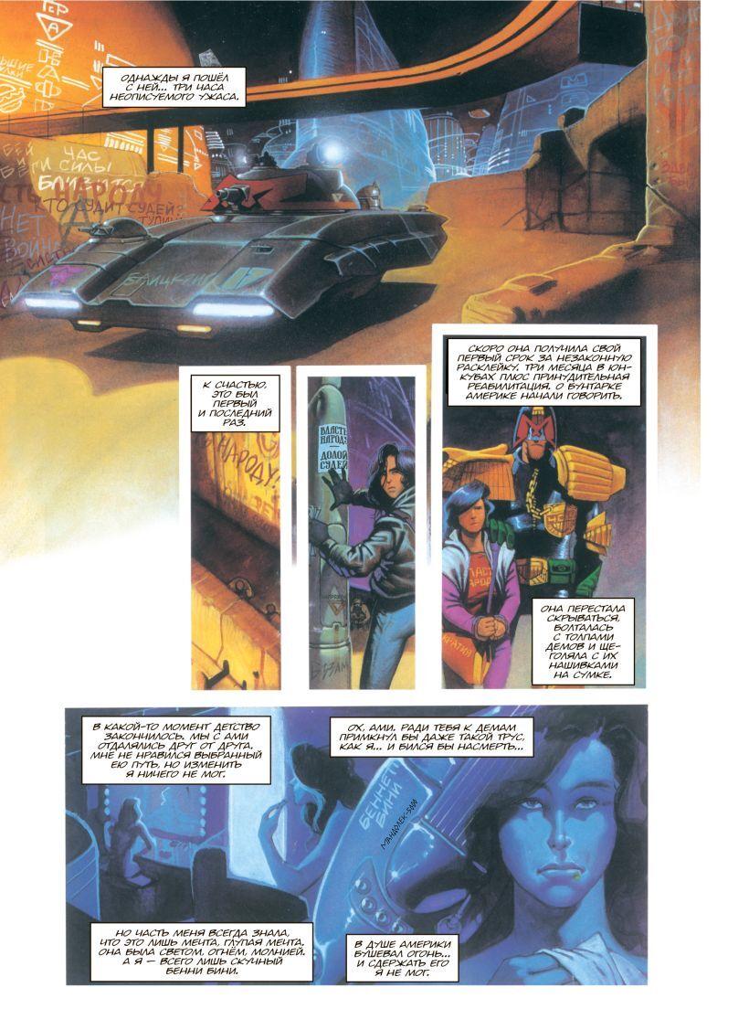 Перед вами лучшая, по мнению критиков, история из серии «Судья Дредд», со сценарием Джона Вагнера и рисунком Колина Макнила. Под обложкой скрывается три комикса: «Америка», давший название всему сборнику, и два продолжения — «Угасающее пламя» и «Курсант». Все они складываются в один большой сюжет о трагической судьбе нескольких людей, их борьбе, мечтах и попытках изменить деспотичный и страшный мир, в котором живёт судья Джозеф Дредд.